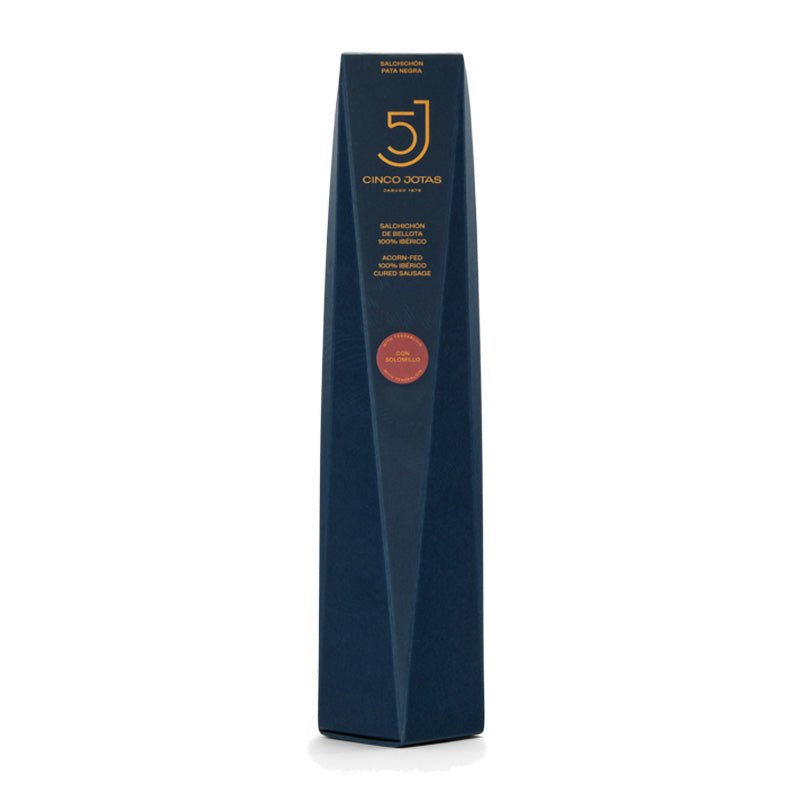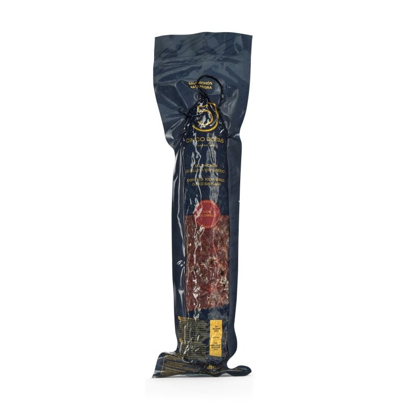 Na Cinco Jotas superamos as normas de qualidade mais rigorosas para obter um produto extraordinário e inconfundível: o Salchichón de bolota 100% ibérico, ou brida negra.
